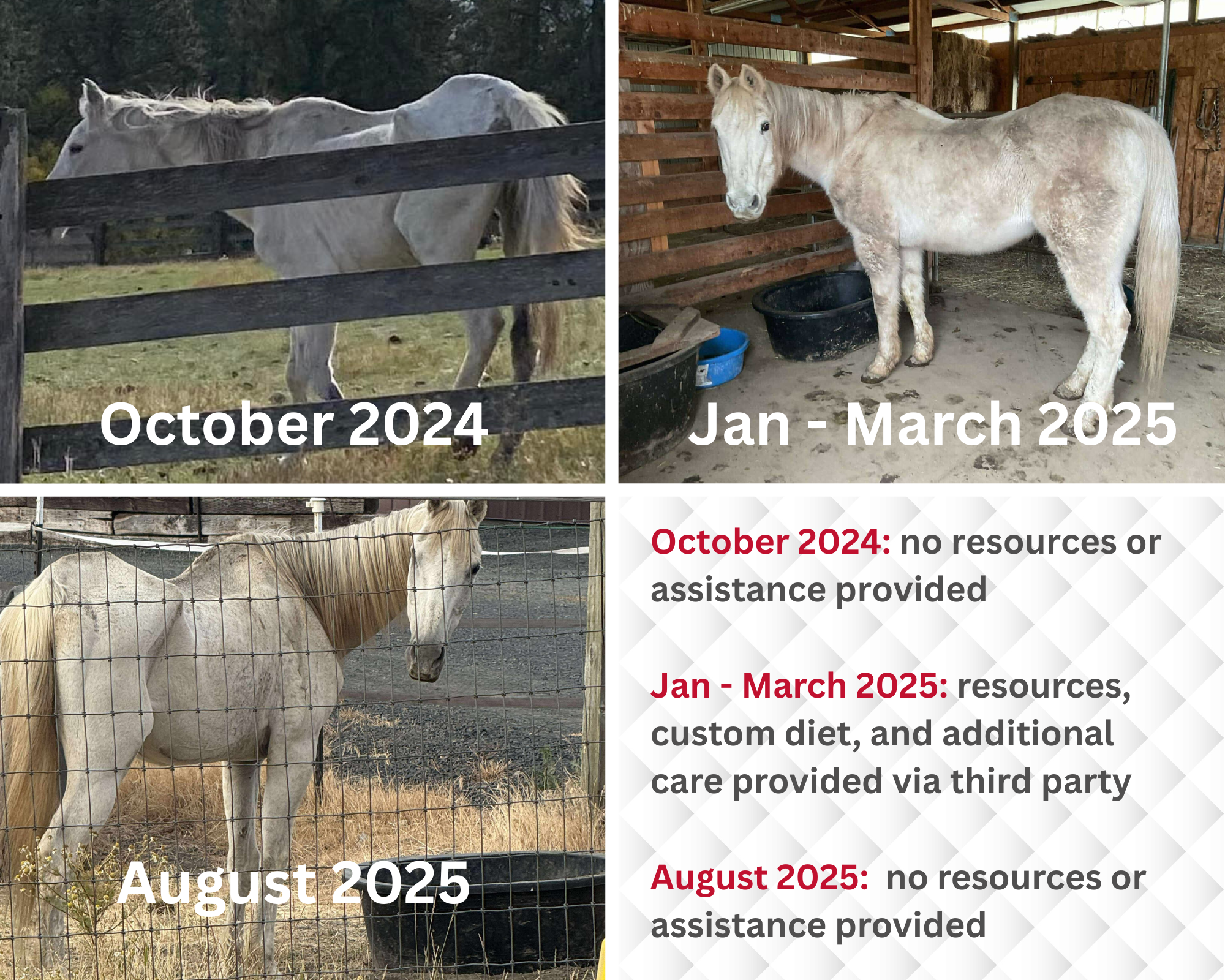 Jul 16, 2025 – Horse fed only once daily per owner; pasture has no nutrition. The owner offered assistance again through the CARE Program and declined the assistance.